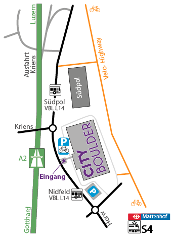 Bei der Passerelle den Lift oder das Treppenhaus benutzen. Die Passerelle überqueren und im Gebäude via Lift/Treppe in den zweiten Stock gelangen. Dann weiter den Beschriftungen bis in die Boulderanlage folgen.
