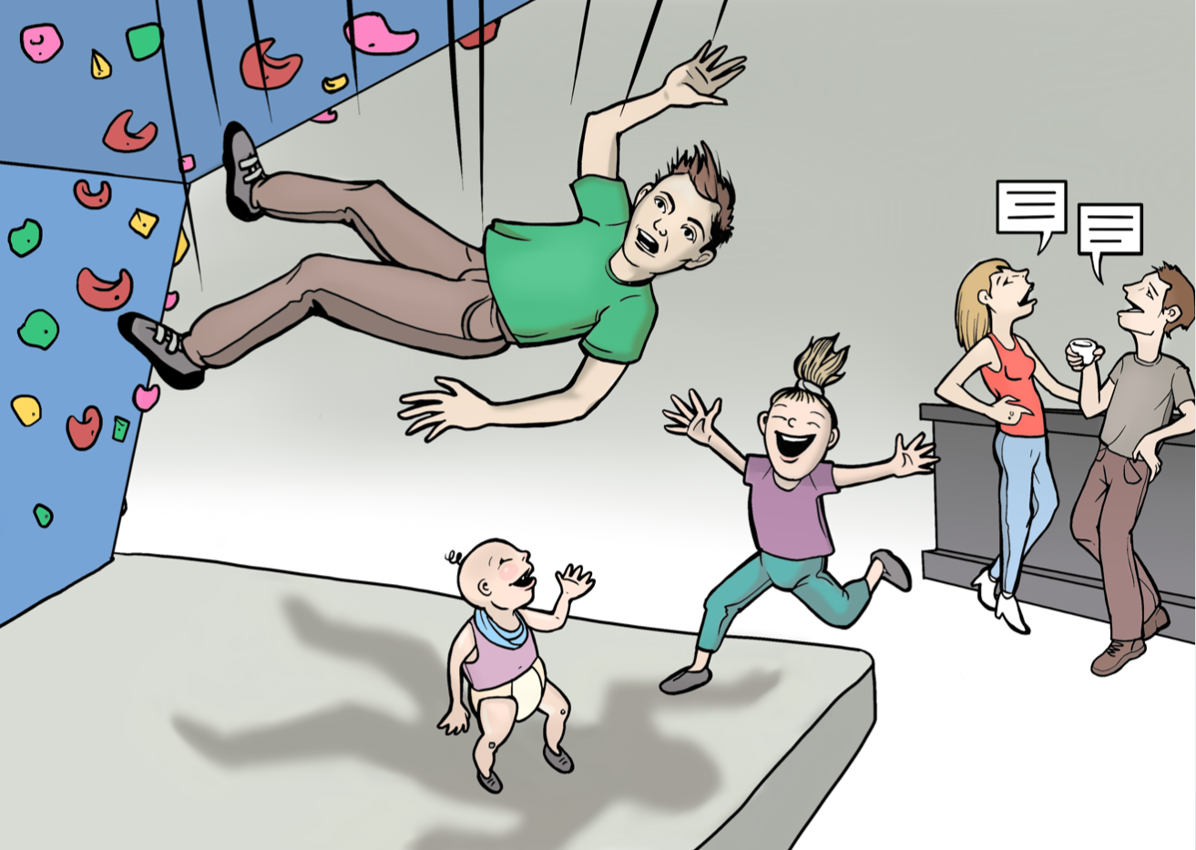 Um Unfälle beim Stürzen zu vermeiden, werden Kinder beim bouldern stets von der Begleitperson beaufsichtigt und gespottet.