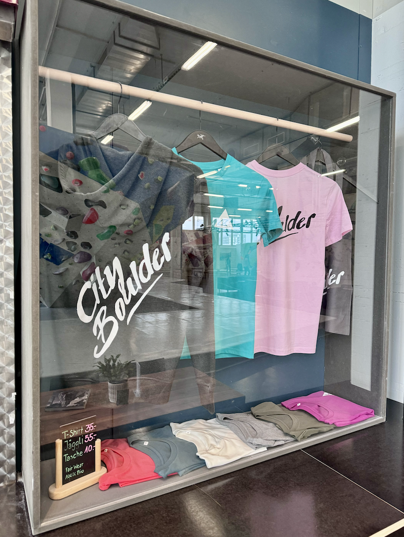Damit du nicht oben-ohne bouldern musst, halten wir eine Auswahl unsere Eigenmarke an T-Shirts und Hoodies für dich bereit. Probier’s mal an!
